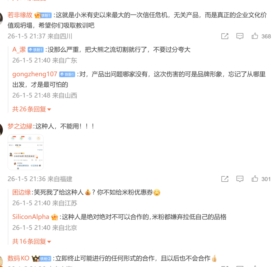 此前,小米投放KOL“全能的大熊”的动静正在米粉中激发庞大争议,正在徐洁云和雷军的微博下,浩繁网友留言抵制,“支撑小米和其他博从投放商单合做,但不克不及投放给每天都小米的大V。”。