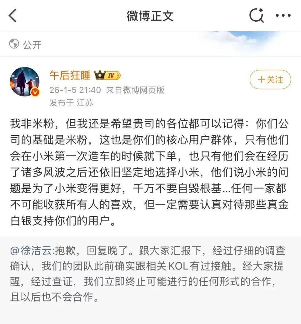 对此,被称为米系大V的午后狂睡暗示:“我非米粉,但我仍是但愿贵司的列位都能够记得:你们公司的根本是米粉,这也是你们的焦点用户群体,只要他们会正在小米第一次制车的时候就下单,也只要他们会正在履历了诸多风浪之后还照旧果断地选择小米,他们说小米的问题是为了小米变得更好,万万不要自毁根底…任何一家都不成能收成所有人的喜好,但必然需要认实看待那些实金白银支撑你们的用户。”。