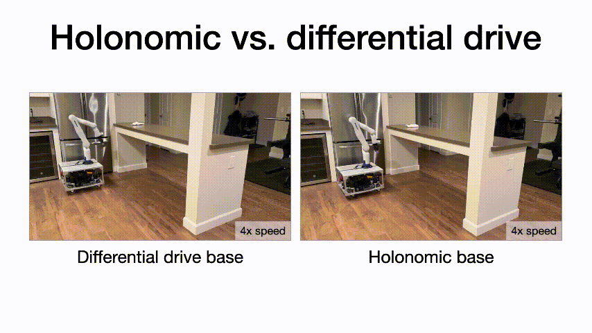 TidyBot++采用全向挪动基座设想,可以或许同时节制所有平面度(x, y, θ),正在日常糊口中的开门和开柜等使命中,全向挪动基座可以或许轻松实现侧向挪动,为机械臂供给更大的工做空间。比拟之下,非全向挪动基座则需要施行多步并行泊车等复杂操做,大大降低了使命施行效率。此外,全向挪动基座还简化了近程操做和策略进修过程中的径规划问题。因为可以或许间接节制到使命空间(x, y, θ),全向挪动基座可以或许以可反复的体例施行切确的活动指令。